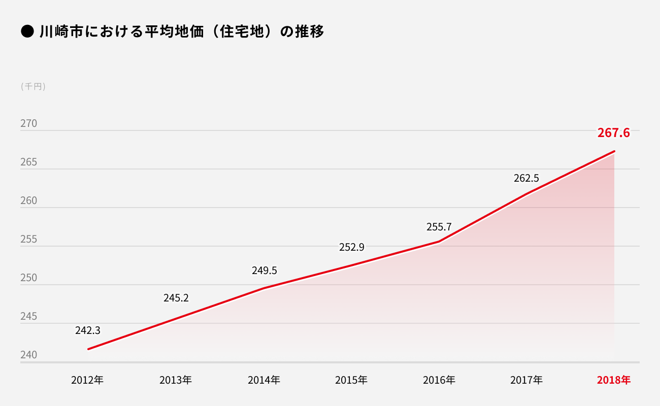 川崎市の住宅地向け地価は2012年から上昇基調が継続しております。