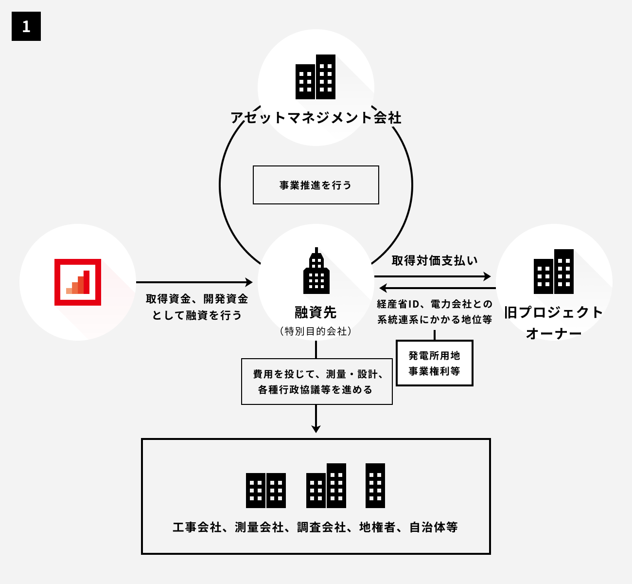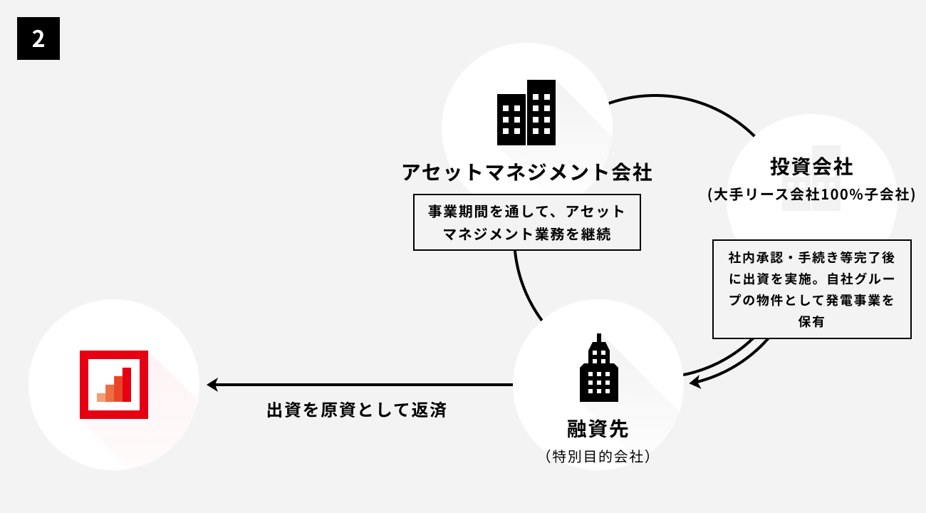 アセットマネジメント会社が組成する特別目的会社が当ファンドの出資金から資金を借り入れて、発電事業にかかる権利、太陽光発電所の用地を確保し(地上権の取得)、発電事業の開発を進めます。その後、同発電事業を自社グループの発電事業として取得する意向を有する東証一部上場大手リース会社の100%子会社であるエネルギー関連投資会社の社内承認・手続き等が完了し、匿名組合出資が実行された段階で当該出資金をもって当該融資の弁済を行う予定です。