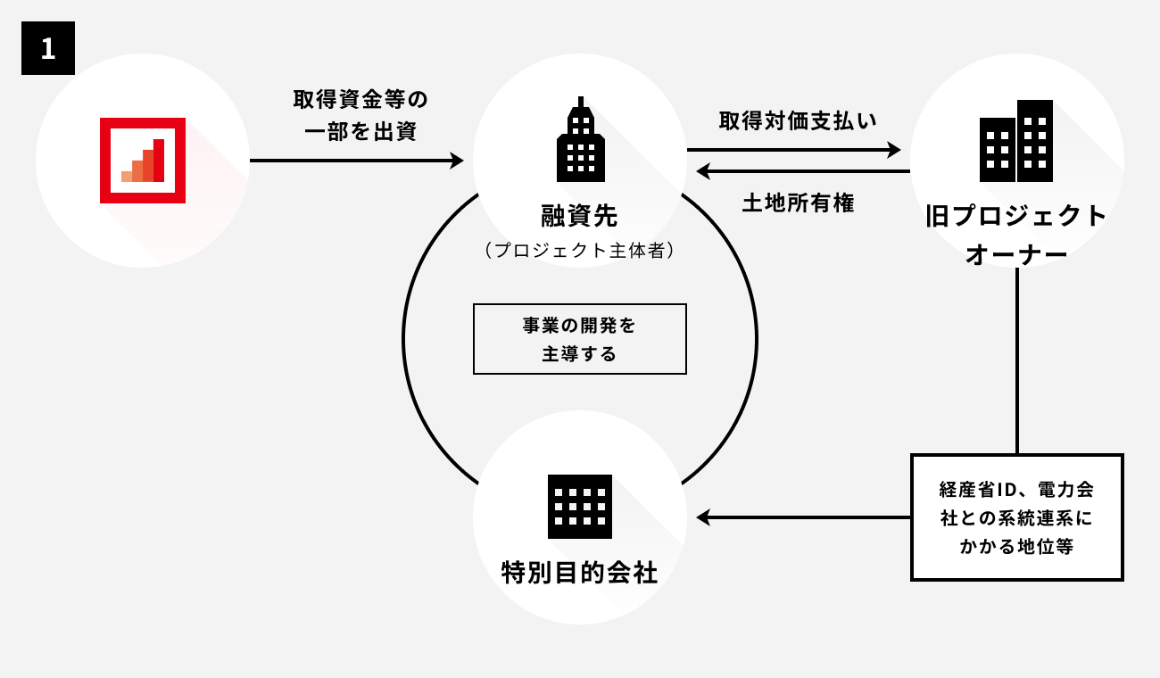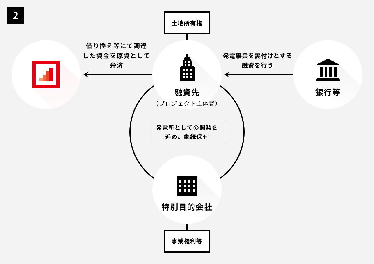 融資先は、発電事業にかかる権利・太陽光発電所の用地を確保し、発電事業の開発を進めます。取得した事業については自社事業として継続的に運営を行っていく予定であり、開発が進行した段階で銀行から事業を裏付けとした融資(借換え)を受け、本営業者からの融資の弁済を行う予定です。