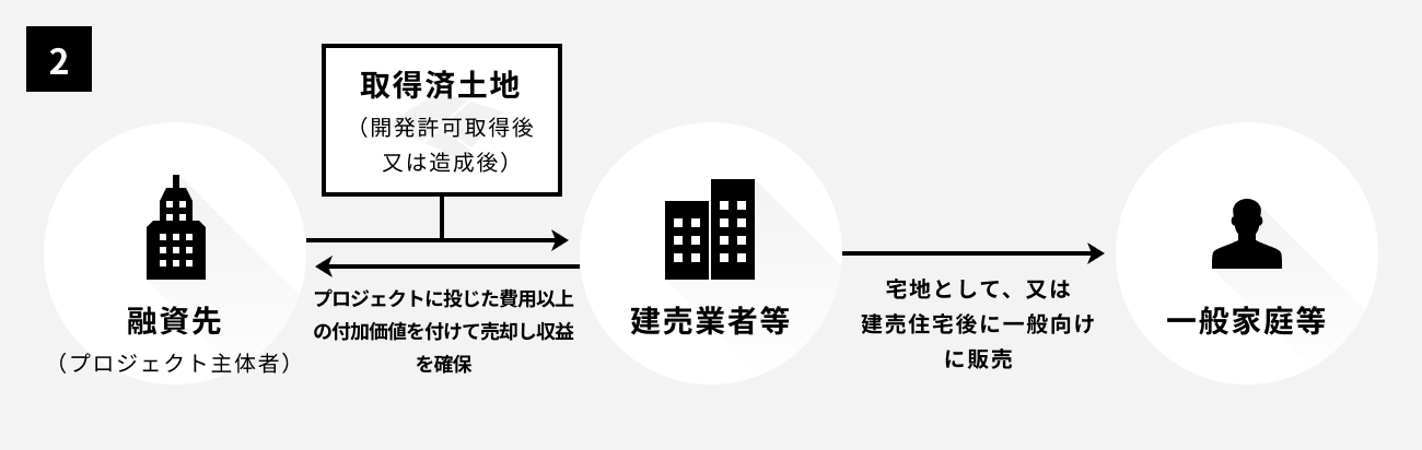 融資先は調達した資金で用地取得を行い、測量・設計費用等を投じ造成許可を取得する予定です。許可の取得後または造成工事後に建売業者等に売却することで収益を得るビジネスモデルとなります。