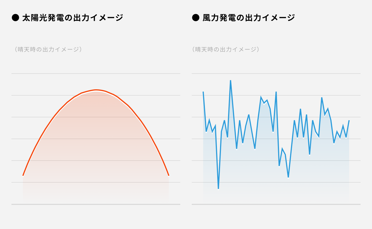 太陽光発電や風力発電は、風や天候に発電量が左右されてしまい、事業者が発電量を調整することや毎時間一定量の電力を供給することが難しいといった面があり、それらの本格的な普及につれ、電力会社は家庭・オフィス等の安定供給を維持するためには、バランスを取る為の調整電源(火力発電等)が必要となる等、デメリットも広く認識され始めております。