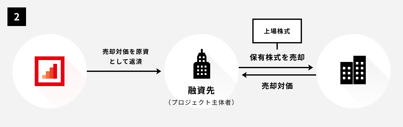 今般、融資先は、本営業者から融資を受けた資金によって既存借入金を返済し、当該上場企業のバリューアップ後に当該株式を売却することで、取得時からの時価上昇分の収益を得るビジネスモデルとなります。