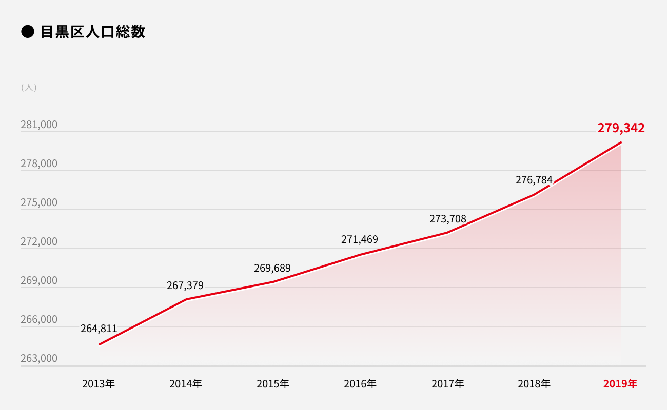 徒歩圏内の各駅は都心の中心的な交通手段となり、駅周辺にもオフィスビル・飲食店が立ち並ぶ等、極めてアクセスが魅力的な立地です。一方、歴史を感じさせる落ち着いた雰囲気を併せ持ち、春を迎えると川の両岸に桜並木が続く目黒川の美しい景色も楽しめる等、幅広い世代に人気のある都心部でも有数のエリアです。