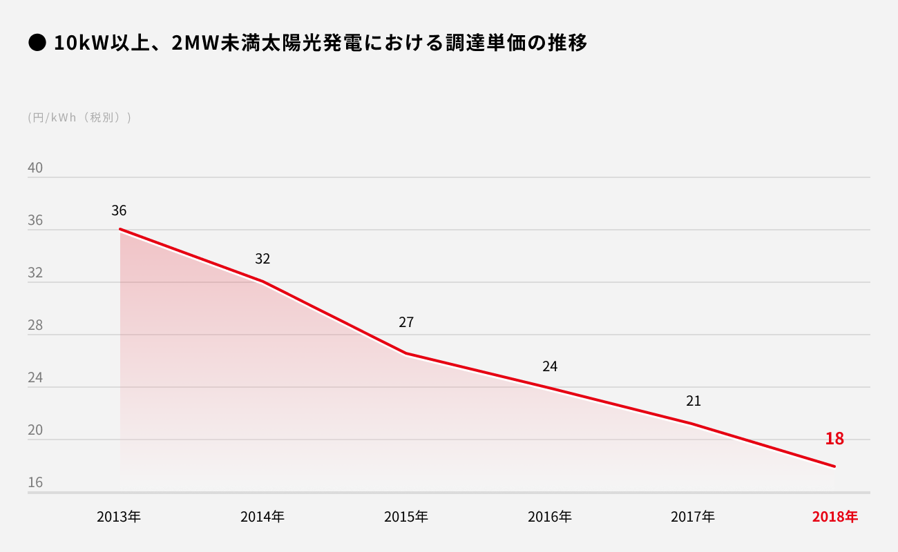 上記グラフのとおり、太陽光発電は業界の技術革新が大きくシステム価格下落のスピードに合わせるように毎年単価の引下げが行われております。