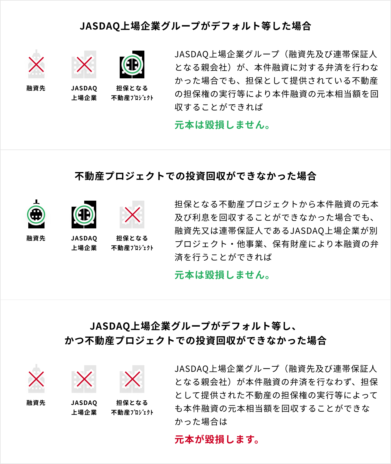 融資先はもちろんのこと、連帯保証を行う完全親会社のJASDAQ上場企業も利払い・返済の責任を負う場合があります。加えて、融資実行額を上回る価値を有すると評価される担保提供も行っておりますので、仮にJASDAQ上場企業グループが本件融資に対する返済を行うことができなかった場合でも、担保の処分等により元本を回収することができれば元本は欠損しません。