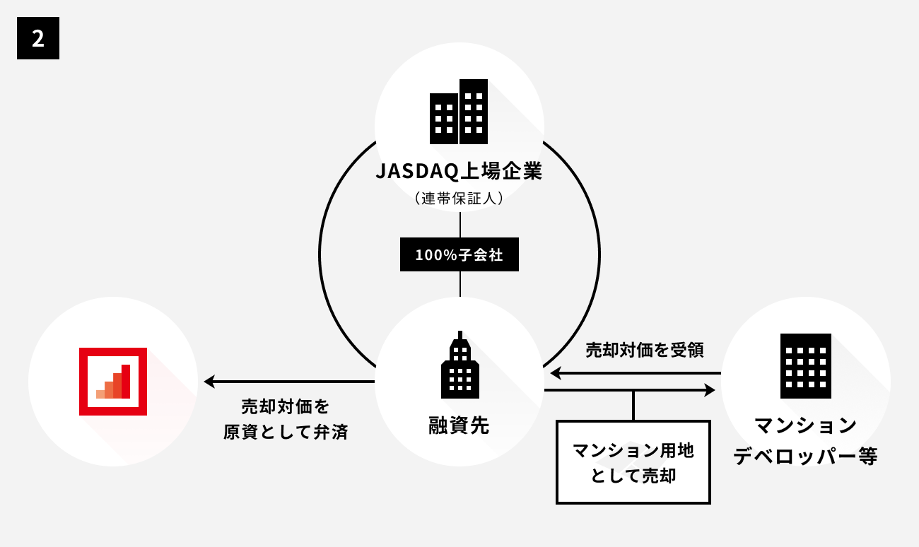 本プロジェクトは、JASDAQ上場企業の100%子会社が本営業者から次の資金使途で資金を借り入れ、担保となる不動産の売却により得られる収益等から本件融資の返済を行います。