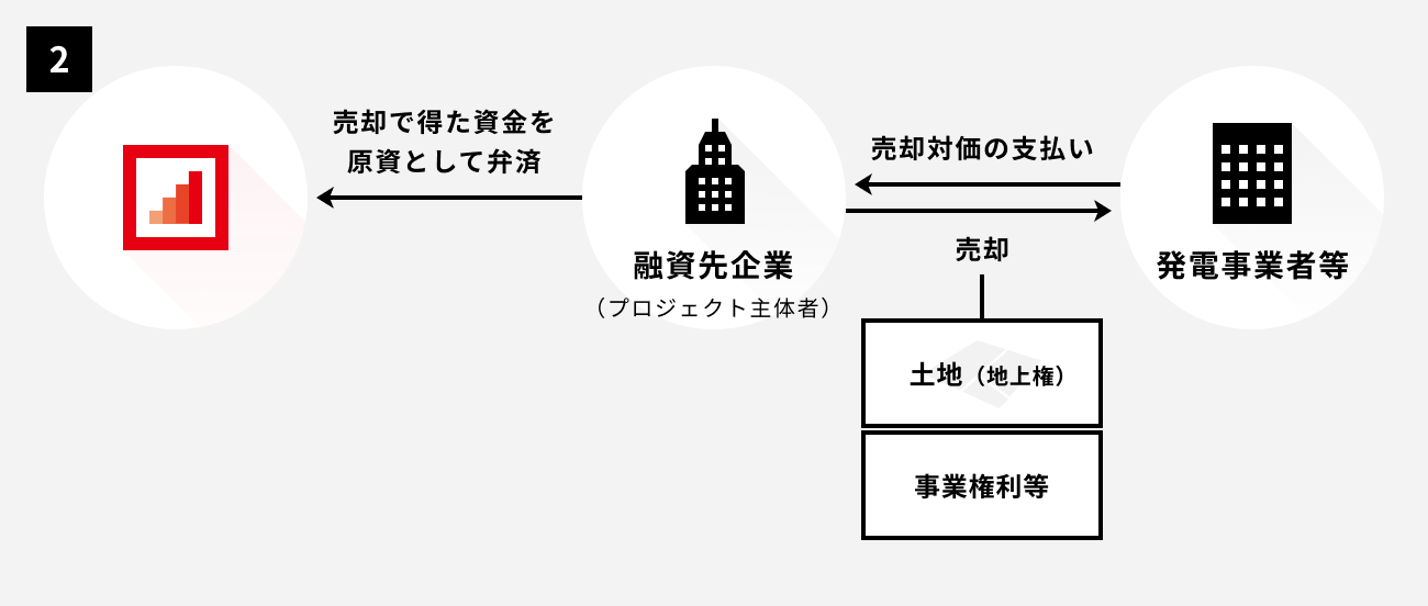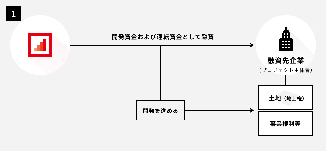 融資先は、全国規模での発電所開発に取り組んだ実績があり、現在も北海道、京都、千葉案件など多数の案件開発を進め、バリューアップ後又は発電所の完成後に売却することで収益を得る取り組みを行っております。