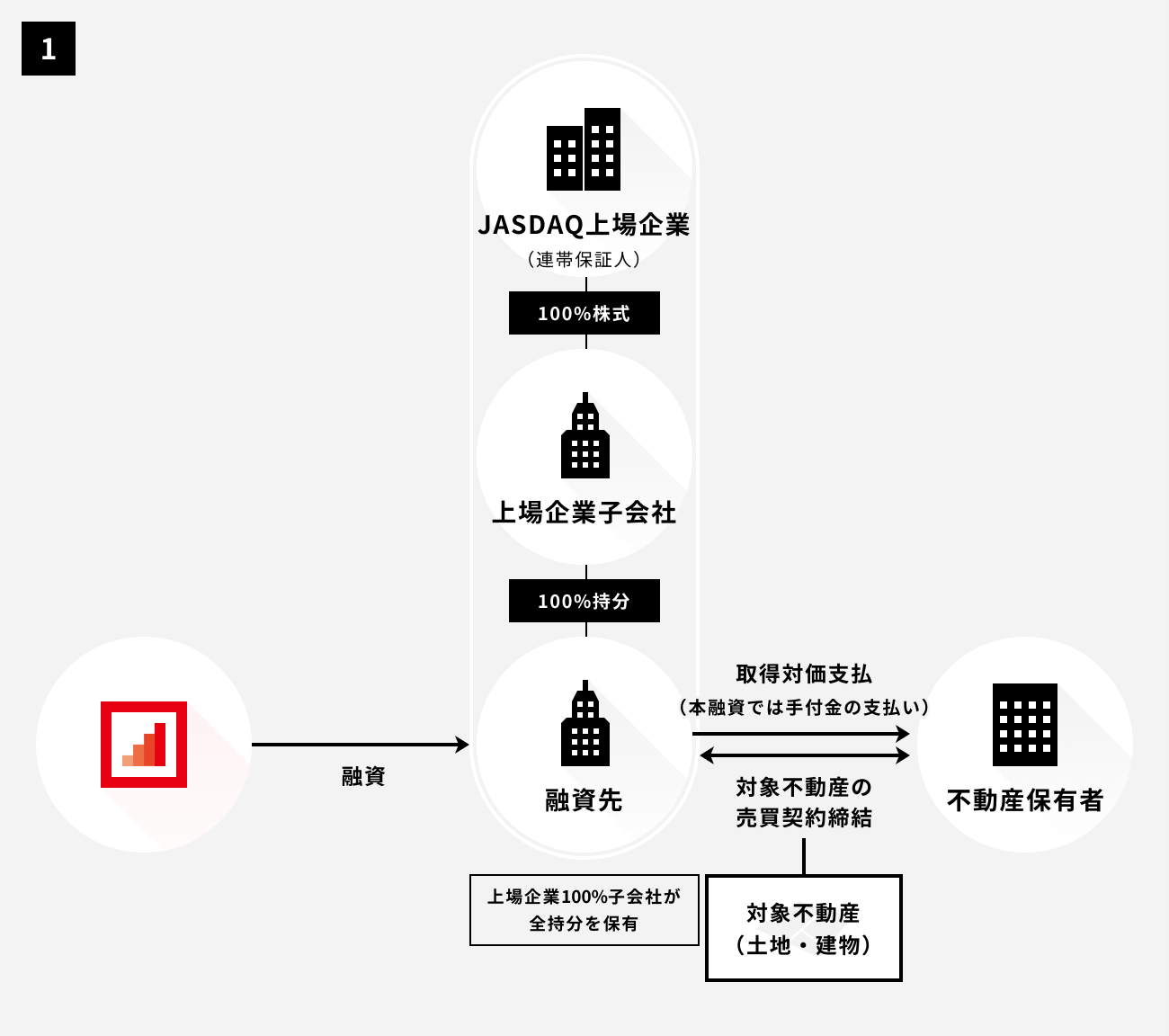 本プロジェクトは、JASDAQ上場企業の100%子会社が全持分を有する特別目的会社(SPC)が本営業者から次の資金使途で資金を借り入れ、対象不動産の売買契約を締結し、その後、対象不動産の売却によりSPCが得られる収益から本件融資の返済を行う予定です。