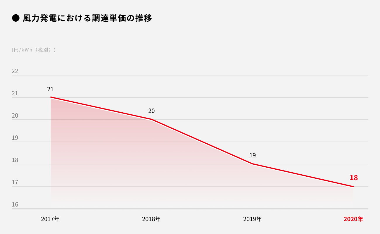 同制度は再生可能エネルギー発電の普及を目的としていることから、技術革新等に伴う工事単価の減少等を踏まえ年度毎に価格の見直しが行われ、制度により保証される電気の買取単価が年々下落しています。