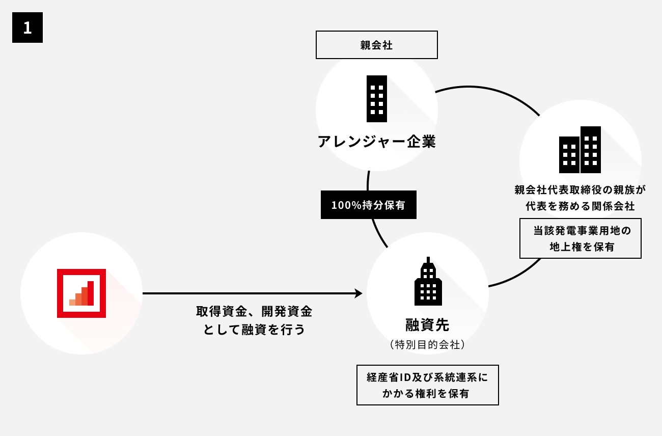 融資先は、調達した資金を用い、100%持分を有する親会社の主導の下で太陽光発電所の開発を進めます。取得した事業については自社事業として継続的に運営を行っていく予定であり、林地開発許可の取得後等、開発が進行した段階で金融機関等から事業を裏付けとした融資(借換え)を受け、本営業者からの融資の弁済を行う予定です。