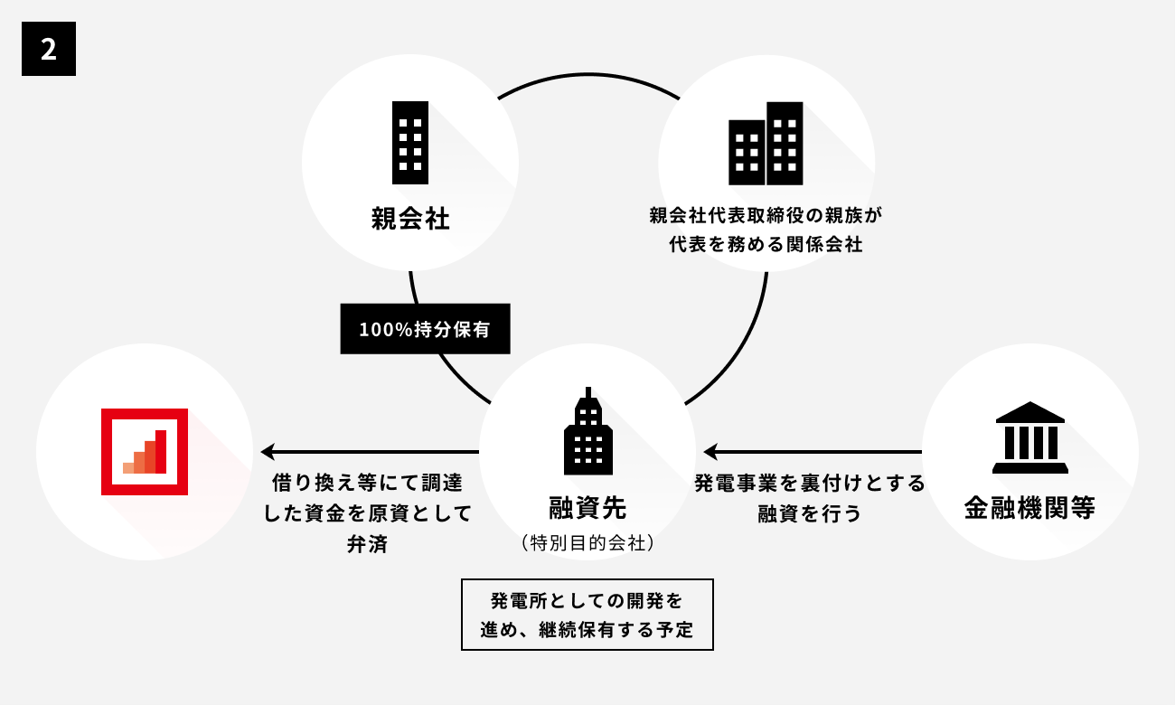 融資先は、本件融資に係る資金を融資先の運転資金として使用し、融資先の100%持分を有する親会社の主導の下で自社事業の太陽光発電事業の開発を進めます。その後、融資先が開発を進めている発電所の建設完了または開発が一定程度進捗した段階で銀行融資に借り換え、その借り換え資金の一部を原資として借入金の返済を行います。
