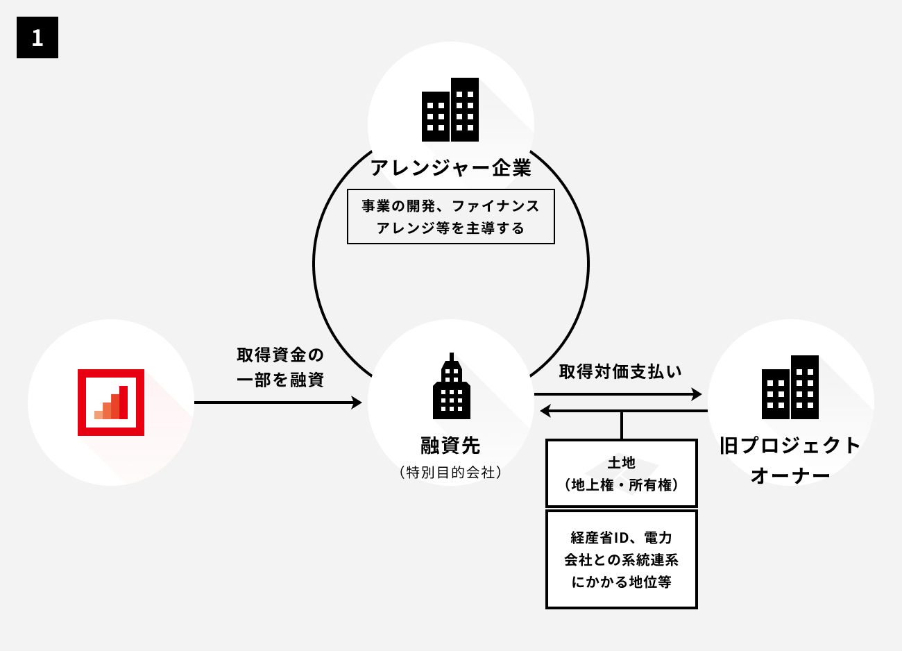 融資先は、調達した資金を用い、発電事業にかかる権利・太陽光発電所の用地(所有権および地上権)の取得代金の一部を支払い、アレンジャー企業の主導の下で太陽光発電所の開発を進めます。本件発電事業については自社事業として継続的に運営を行っていく予定であり、開発が進行した段階で銀行又は外資系ファンド等から事業を裏付けとした融資(借換え)を受け、本営業者からの融資の弁済を行う予定です。