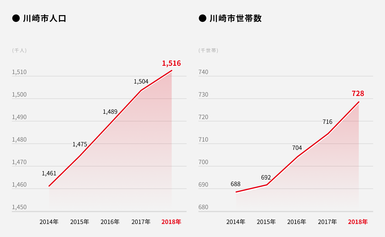 川崎市の人口・世帯数ともに安定して増加傾向にあり、2018年には150万人超、70万世帯超に達しております。