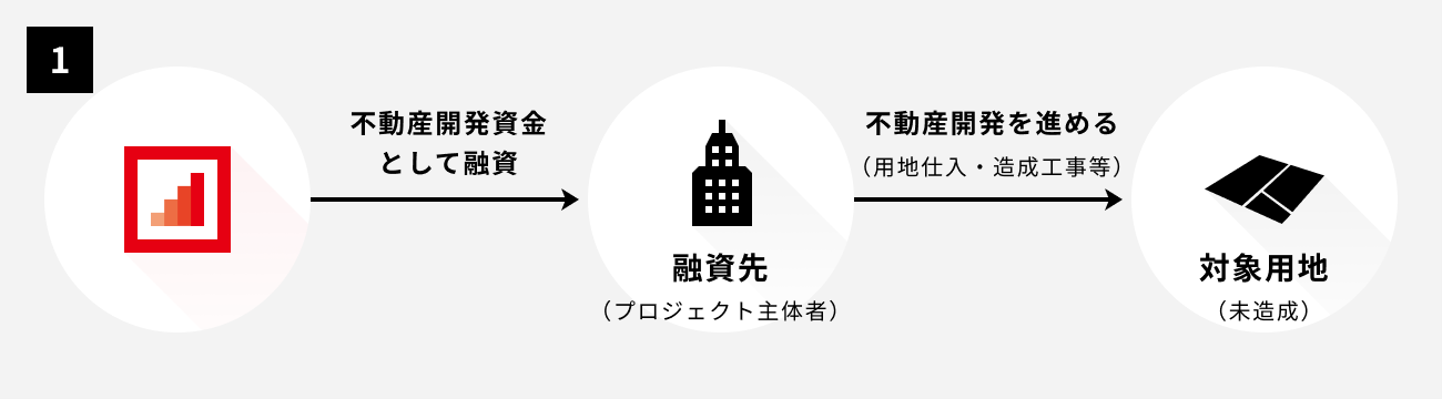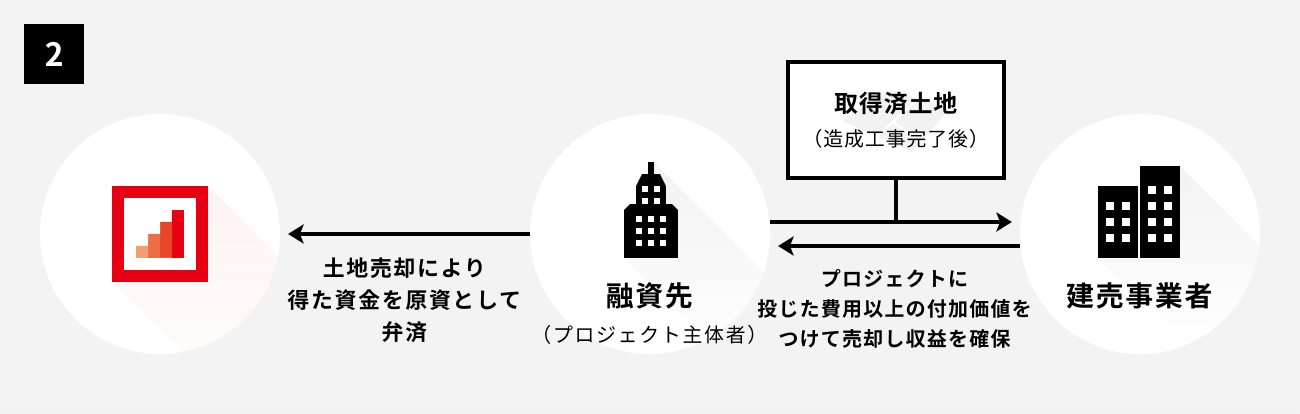 融資先は、調達した資金で開発総面積1万m2弱に対し、換地面積を除いた約5,000m2の開発工事を一貫して行い、64区画(うち地主換地区画18区画)の宅地に仕上げ、建売業者等に売却することで得る資金をもって当該融資の弁済を行う予定です。