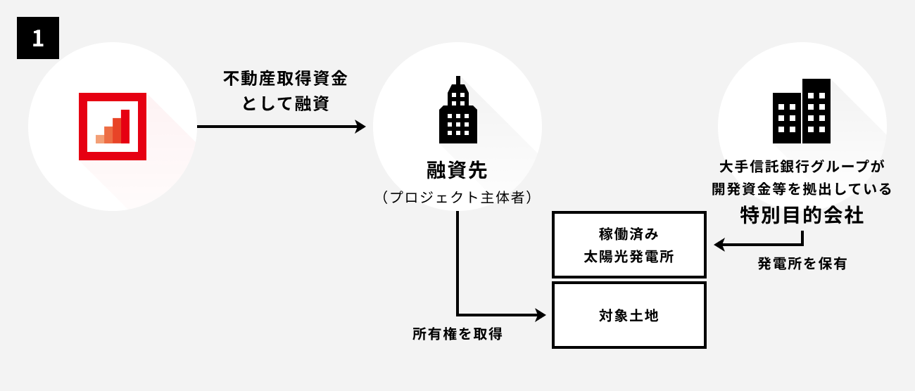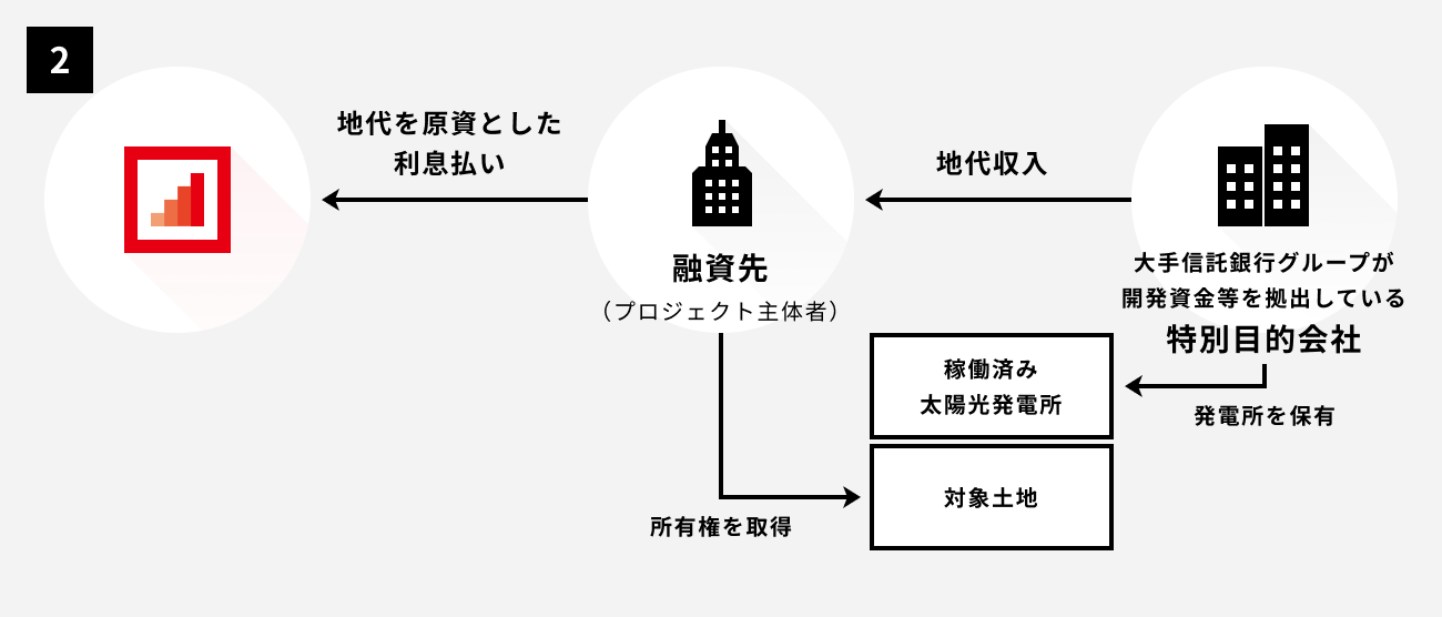融資先は、調達した資金で稼働済み太陽光発電所が設置された土地を現所有者から取得します。当該土地に対しては、大手信託銀行グループが開発資金等を拠出している特別目的会社が地上権を設定しており、土地を所有しているだけで同地上権に伴う地代が安定的に得られることが見込まれます。