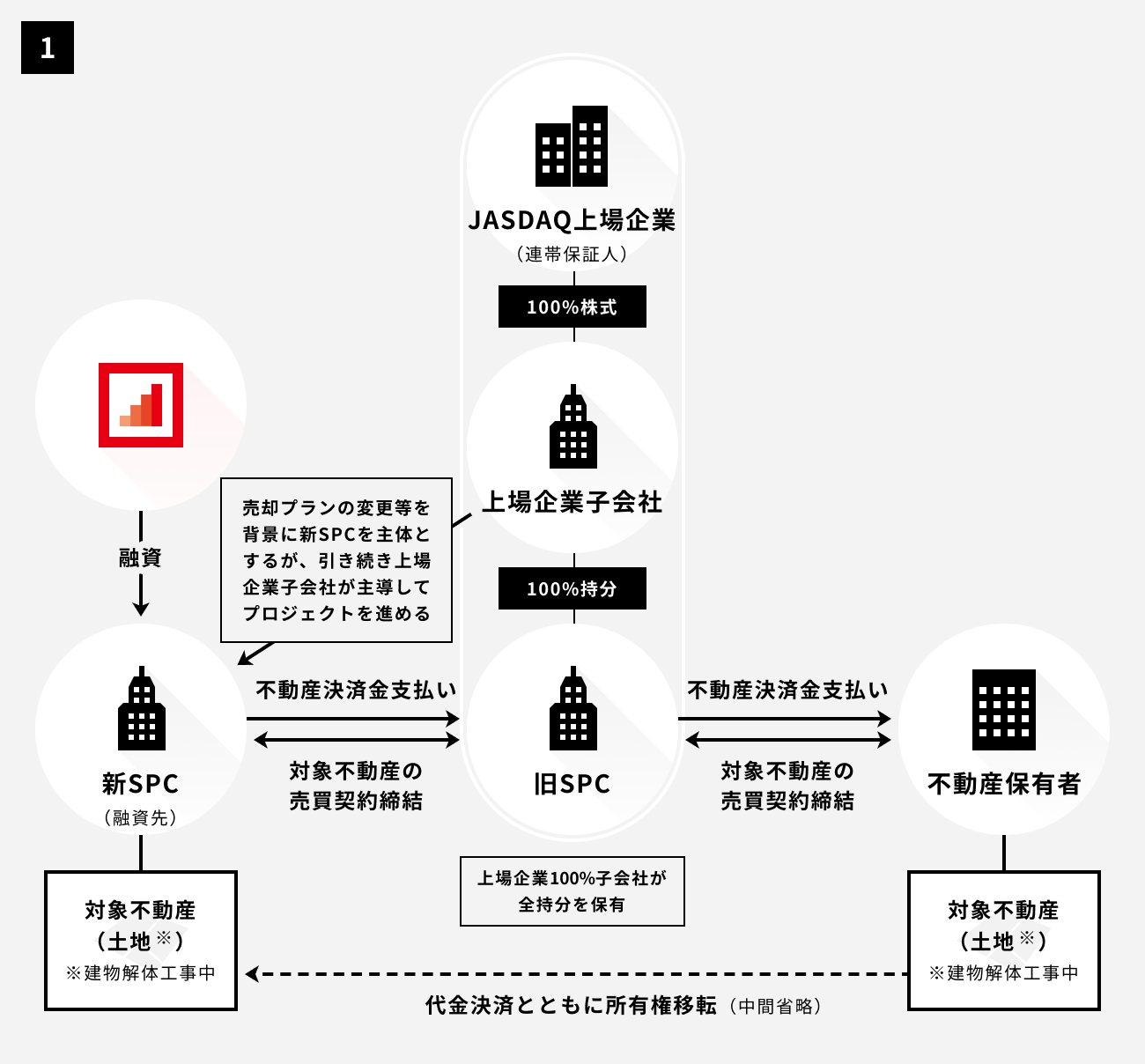 本プロジェクトは、従前当社にて募集した別ファンドの資金等を裏付けとする融資金を原資として、アレンジャー企業が全ての持分を有する特別目的会社(以下「旧SPC」といいます)を通じ、一部の決済金支払い等を行い、開発・売却活動を進めておりました。その後、有力な売却候補先において建物建設開始後に購入したい意向が示されたこと等を背景として、総額決済により不動産を取得し、建設工事の準備、着工まで進めるよう方針変更するとともに、別の新たな特別目的会社(以下「新SPC」といいます)をプロジェクト実行主体とする為、新たな融資案件としてファンドの募集を行うものとなります。