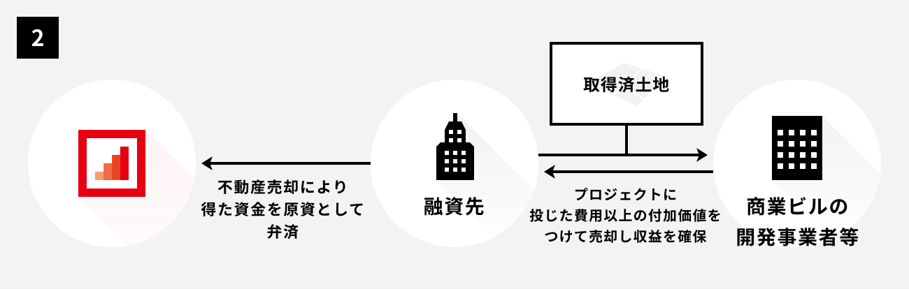 本プロジェクトは、本営業者から次の資金使途で資金を借り入れ、JASDAQ上場企業の100%子会社(以下「アレンジャー企業」といいます。)が主導の下、対象不動産を取得した上で建物の建設工事を進めて、対象不動産の売却によって得られる収益から本件融資の返済を行う予定です。