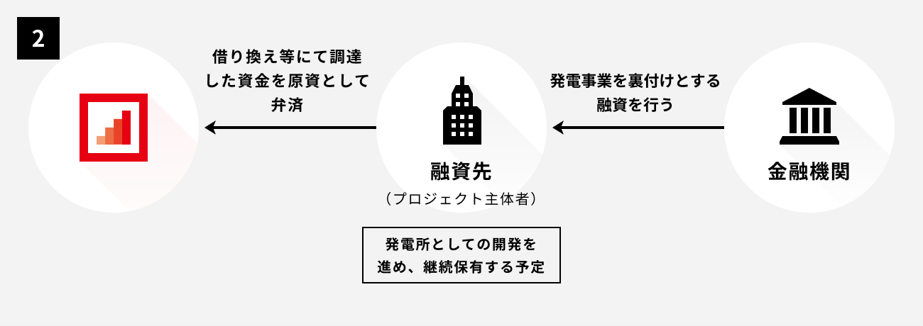 融資先は調達した資金で発電所用地・事業権利等を取得し、発電所の開発を進めます。その後、融資先が開発を進めている発電所の建設完了または開発が一定程度進捗した段階で銀行融資に借り換え、その借り換え資金の一部を原資として借入金の返済を行います。