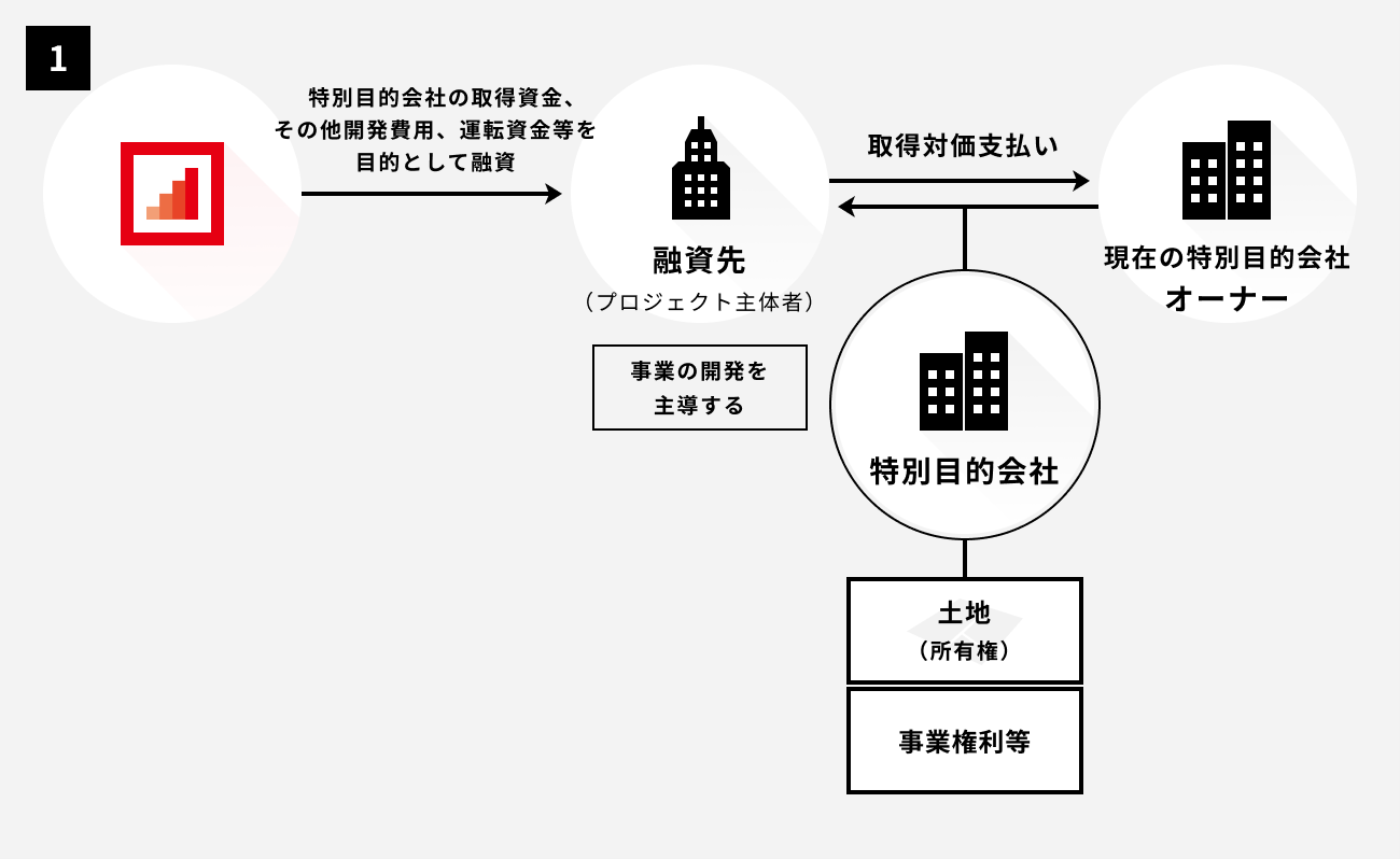 融資先は本発電所の土地・権利を保有する特別目的会社を取得し、発電所の開発を進めます。発電事業開発が一定程度進捗した段階で本発電事業又は特別目的会社ごと売却することで、当該売却資金等により返済を行う予定です。