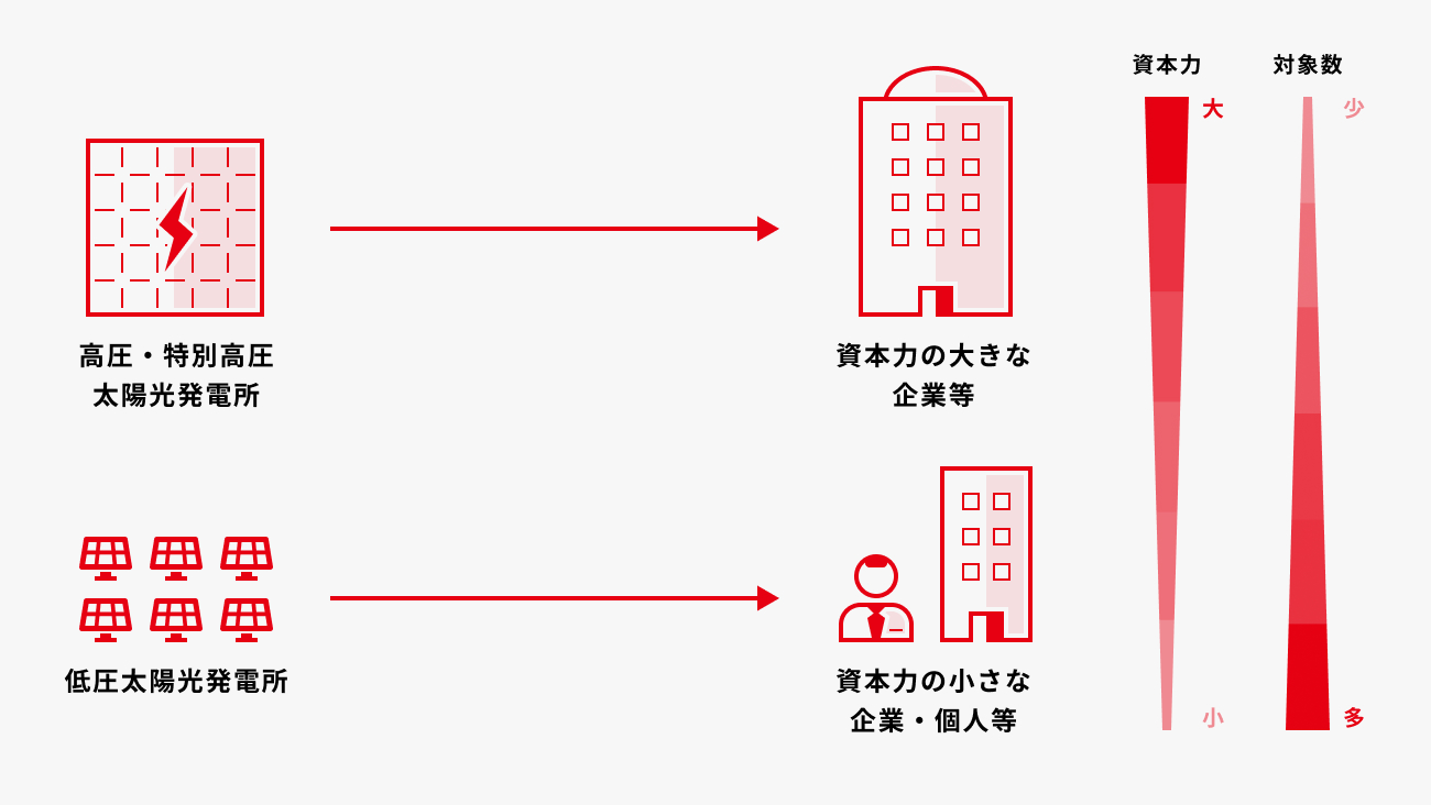 太陽光発電所は設備容量の規模によって、低圧、高圧、特別高圧と区分することができ、今回のプロジェクトは複数のエリアにて、低圧発電所を開発し、売却する予定のものとなります。