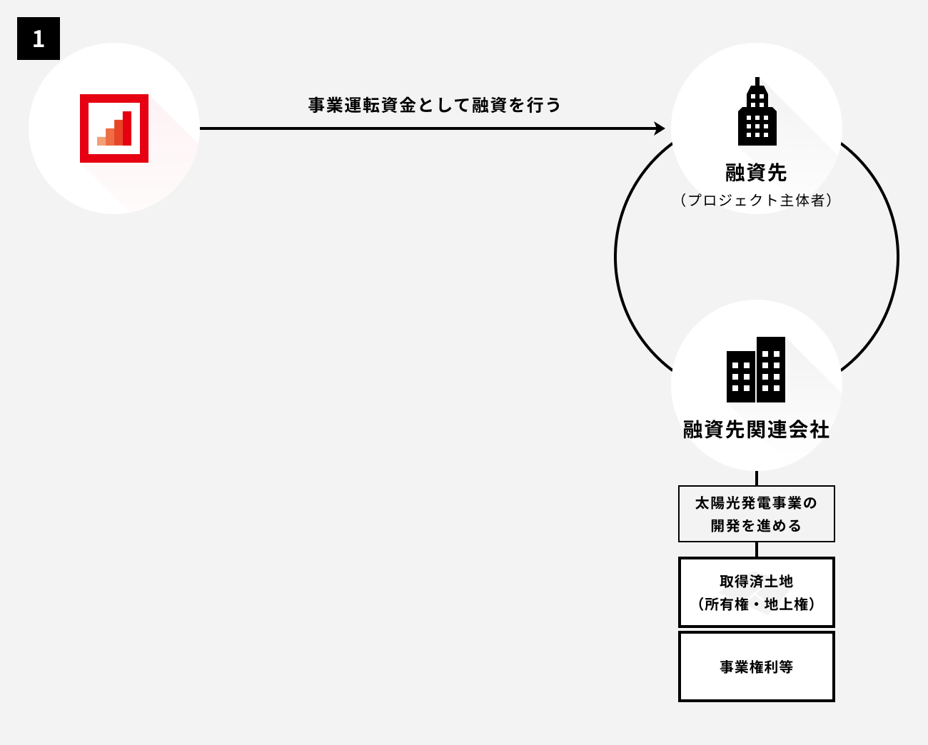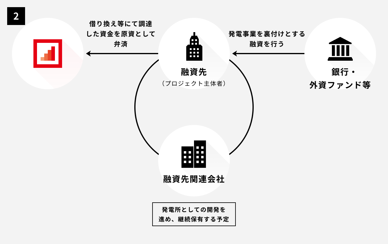 今回、融資先グループが保有している太陽光発電事業の一つを担保として調達する資金を用い、上記の取り組みを進め、銀行又は外資系ファンド等から受ける借り換え資金の一部を原資として融資の弁済を行う予定です。