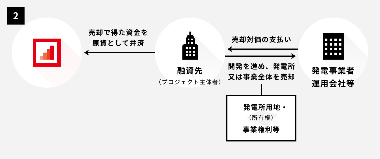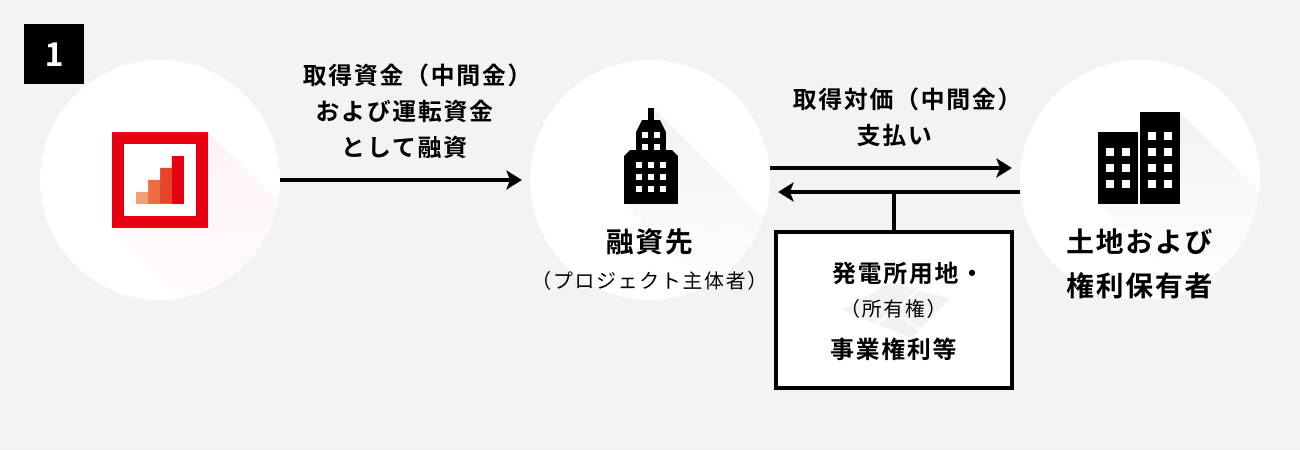 融資先は、調達した資金で太陽光発電事業の取得のための中間金を支払い、発電所の開発を進めます。開発が進捗した段階で当該発電事業を売却し、得られる資金を原資として、本営業者からの融資の弁済を行う予定です。