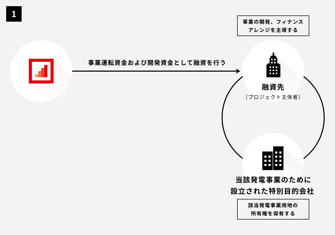 融資先は、本件融資に係る資金を融資先の運転資金として使用し、自社事業の太陽光発電事業のために設立され、用地所有権を有する融資先グループの特別目的会社とともに太陽光発電事業の開発を進めます。その後、開発が一定程度進捗した段階で本発電事業又は発電所にかかる権利等を特別目的会社に移譲した後に特別目的会社ごと売却することで得る売却資金等により返済を行う予定です。