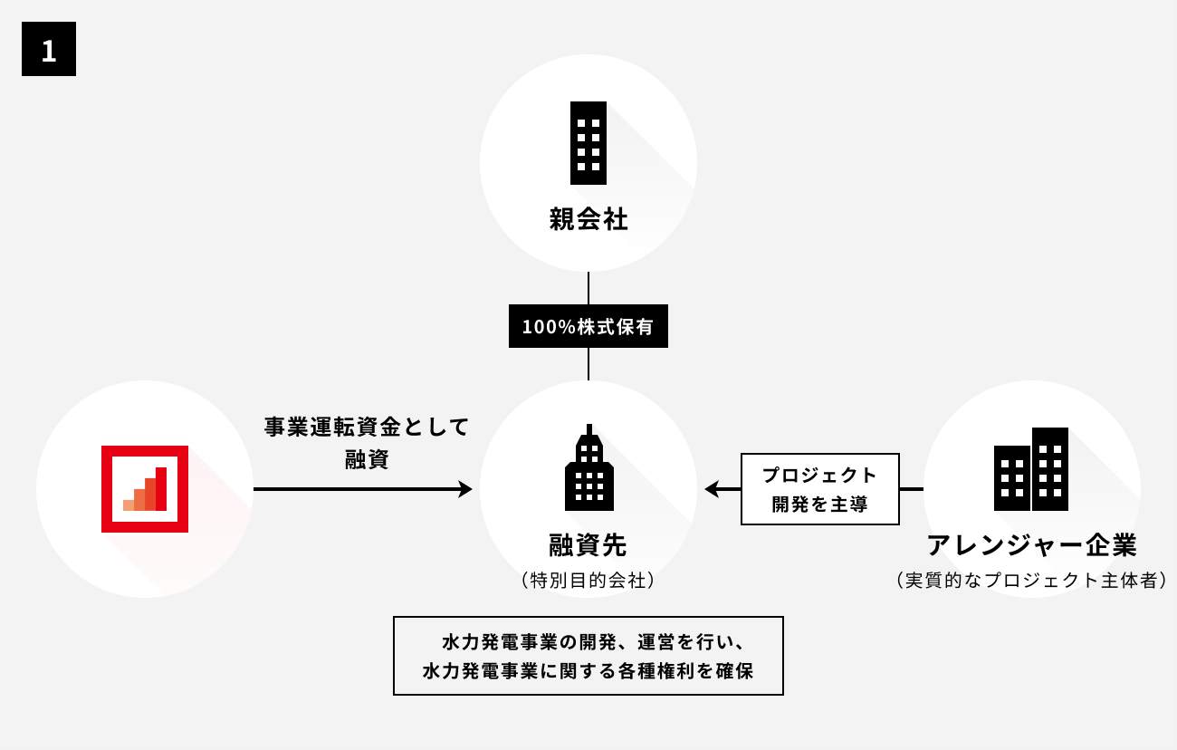 融資先は、奈良県における水力発電事業を事業目的とする特別目的会社となります。プロジェクトの開発を実質的に主導する企業は、国内外で水道事業、水力発電事業を複数手掛けており、水資源に関連する設備設計、計画の策定、利水許可等の許認可に係る役所等の折衝に強みを有しております。