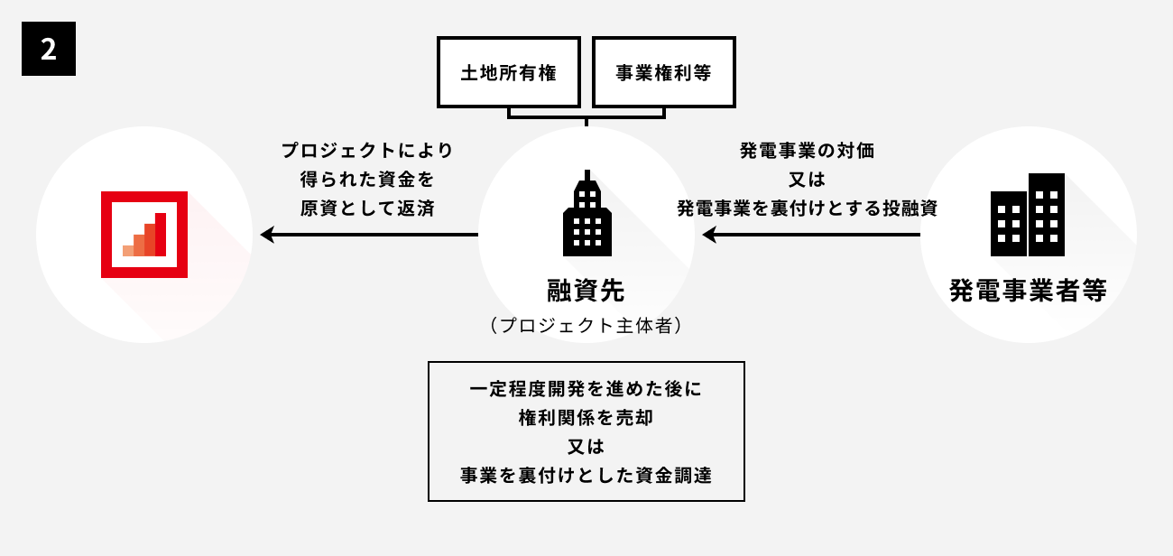 本事業については、大手総合商社グループの発電事業会社、外資系大手証券会社グループの発電事業会社等が関心を示しており、開発が一定段階進捗した段階で、事業譲渡、第三者割当増資等を行うことによって得られる資金を原資として、本営業者からの融資の弁済を行う予定です。