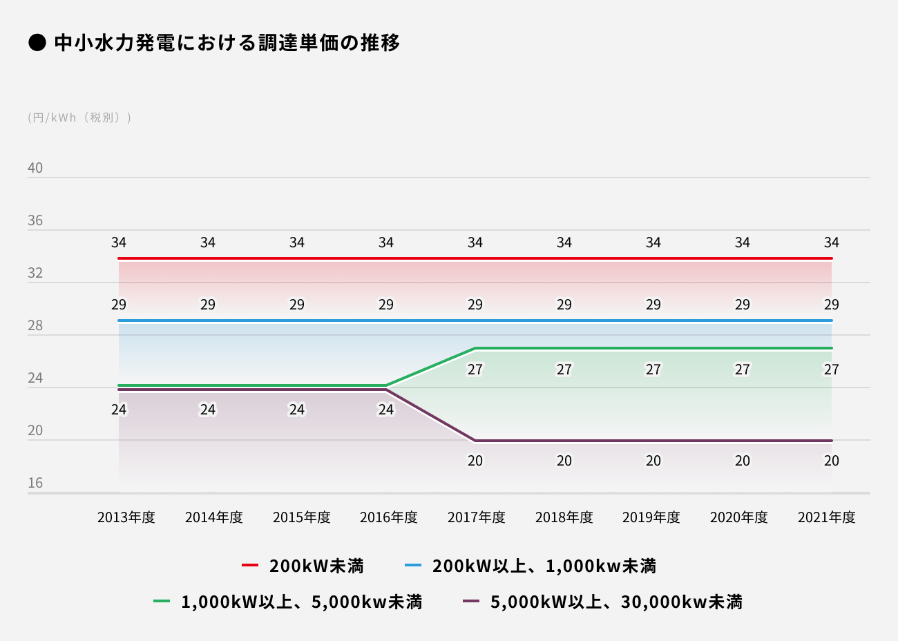 しかし、水利権の確保等に関する自治体の手続きや協議等が必要であり、一定のノウハウを有する事業者以外はこれらの制約に対するハードルが高く、普及が拡大していないとも言われております。このような背景も含め、中小水力発電所に対する調達単価は数年前から一部を除き維持されており、2021年度分までは変更される予定が無いと公表されており、経済産業省としてもこれまで以上の普及を期待しているとうかがうことができます。