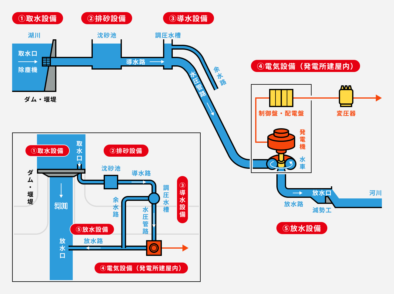 ⑤放水設備:取水した水を元の水路に放出して戻すための設備
