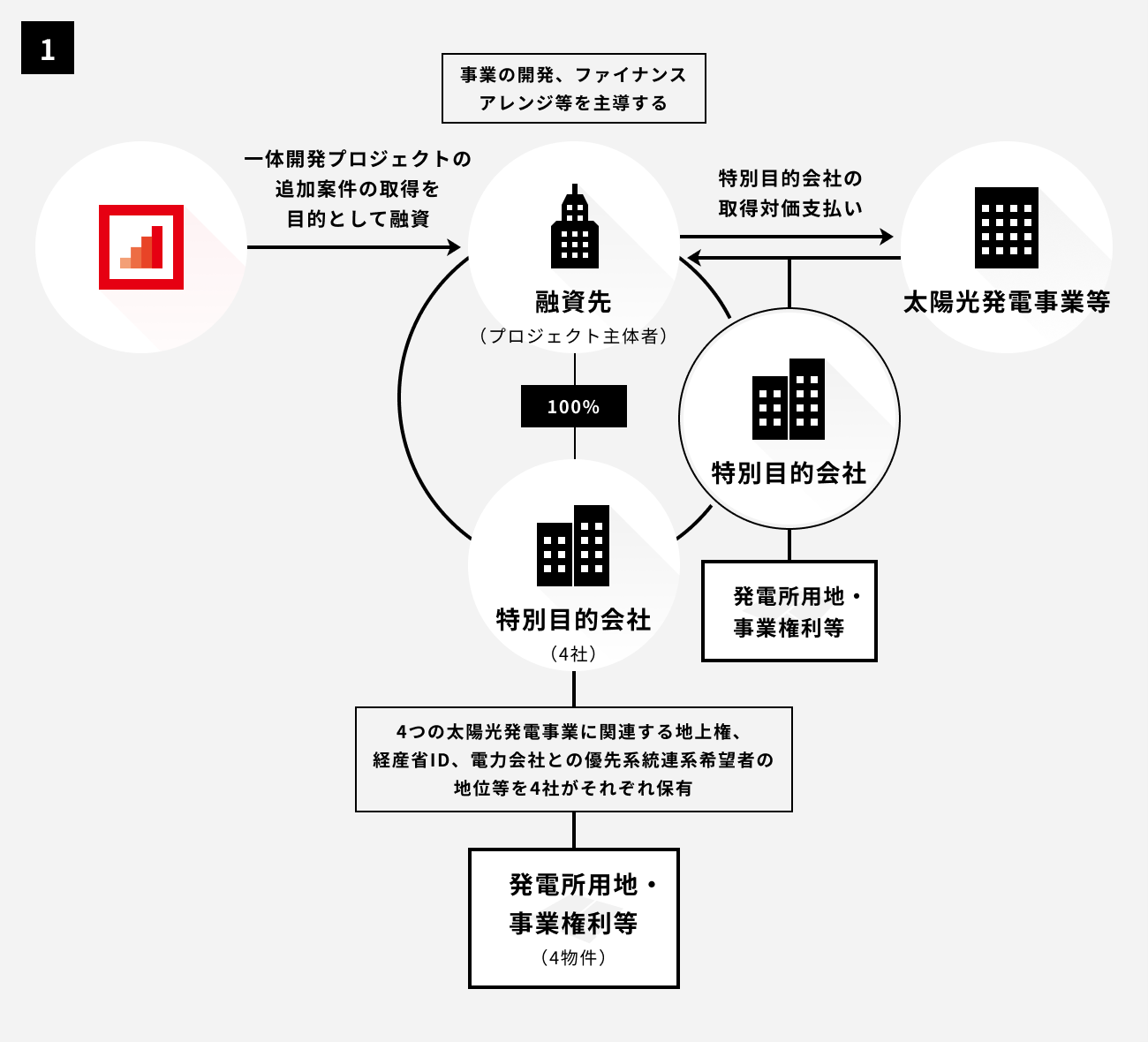 本プロジェクトは本営業者から次の資金使途で資金を借り入れ、担保となる太陽光発電事業又は同事業を保有する合同会社の売却により得られる収益等から本件融資の返済を行います。