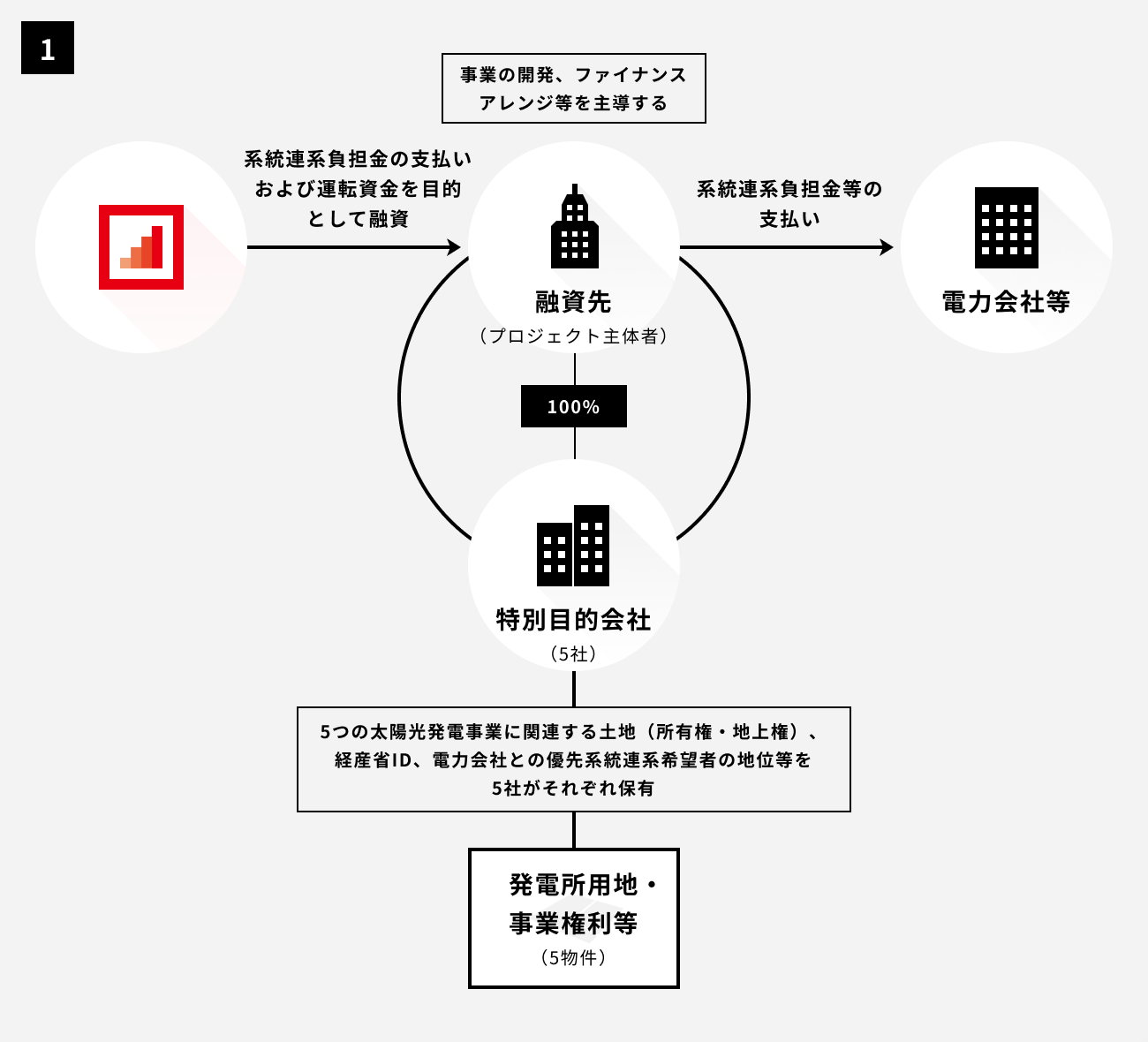 融資先は、調達する資金を用い、保有する合同会社5社が権利・土地(所有権・地上権)を有する太陽光発電事業にかかる系統連系工事負担金を電力会社に支払います。各発電事業の所在は同一の開発エリアであり、一体的に開発を行った上で太陽光発電事業の権利関係又は合同会社自体を売却し、本営業者からの融資の弁済を行う予定です。