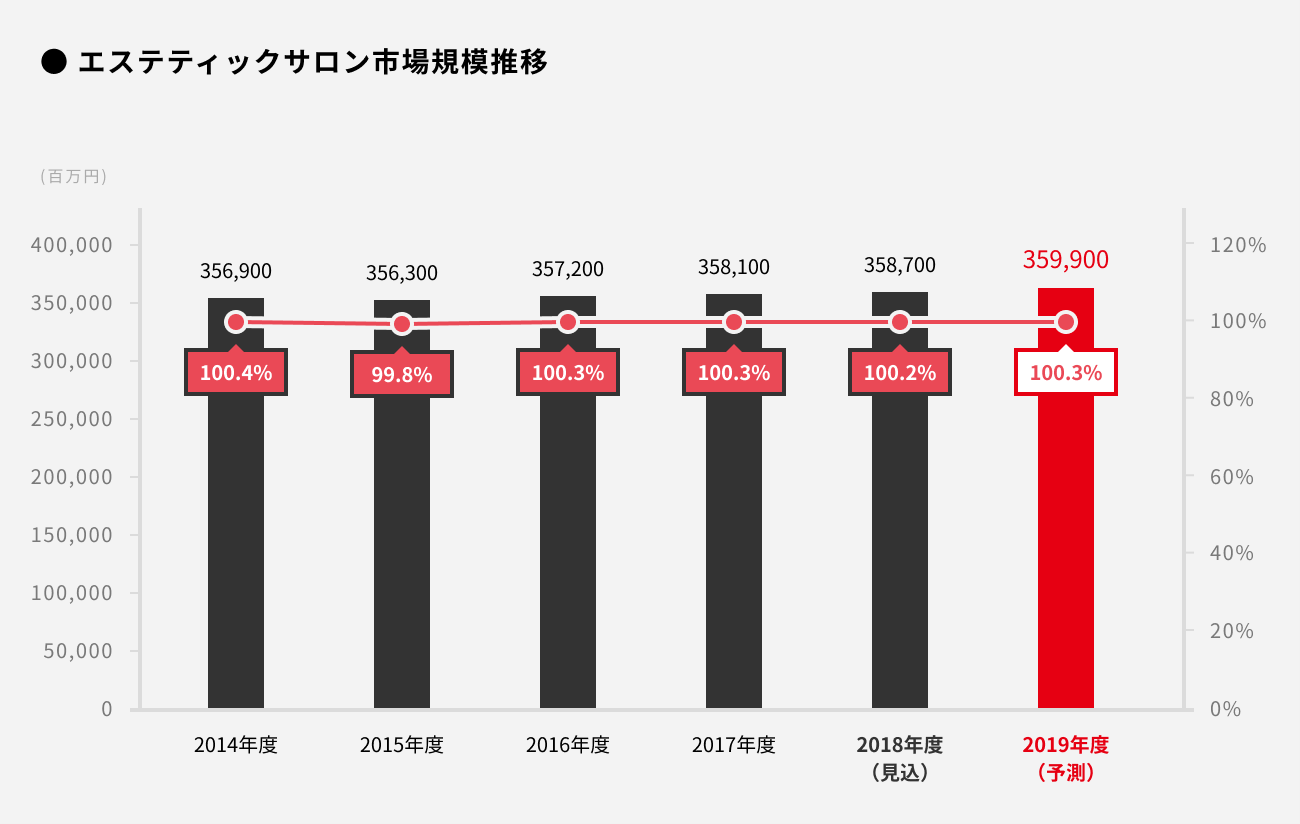 矢野経済研究所によると、2014年度以降、エステティックサロンの市場規模は事業者売上高ベースで横ばい~微増程度で推移しており、2019年度の市場規模はは前年度対比100.3%の3,599億円と予測されております。来店顧客に対して化粧品や健康食品、美容機器といった家庭用の美容商材を推奨販売することでの売上拡大が期待されており、大手企業を中心に多店舗化戦略から最適且つ効率的な人員やサービスの適正配置による店舗展開への転換が強化されていくと考えられています。