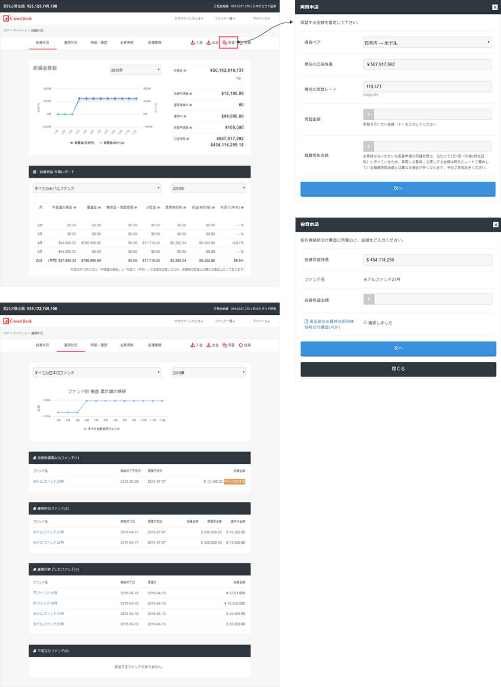 「米ドルによる募集・運用ファンド」および「円⇔米ドルの両替サービス」の開始時期につきましては、別途、クラウドバンクWEBサイト上で公開いたします。