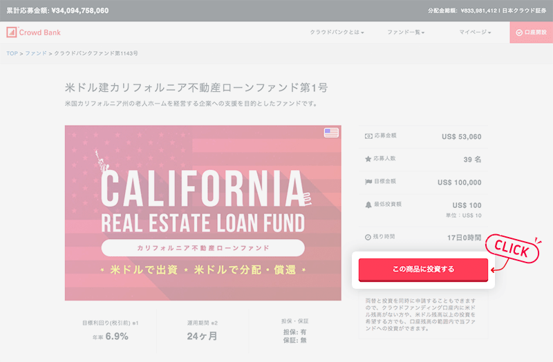 ファンドページの「この商品に投資する」をクリックすれば、口座残高の範囲内で投資と両替を同時に申請することができますので、口座に米ドルの残高がない方でも、また、米ドルの残高以上の投資を希望する方でも、投資申請が可能です。