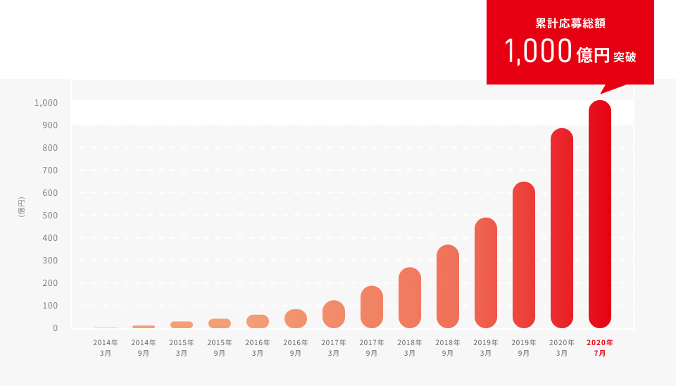 「クラウドバンク」では、2013年12月のオープンから6年7か月、おかげさまで2020年7月に応募総額1,000億円を突破いたしました。