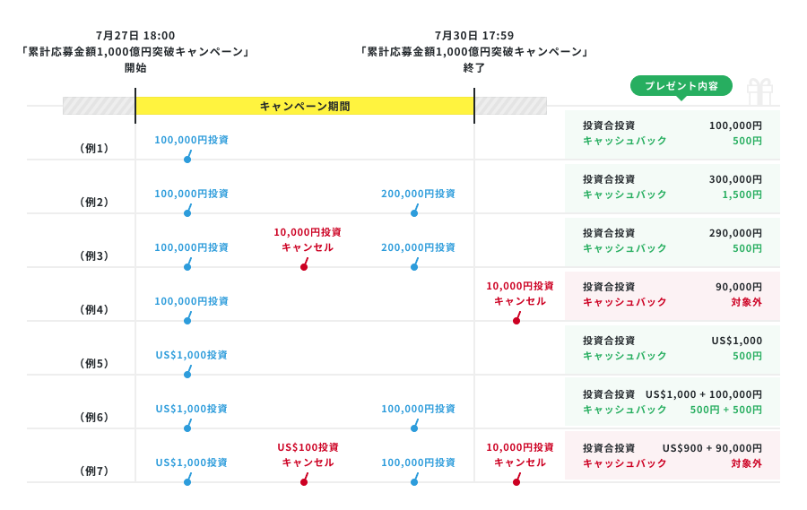 ※キャンペーン期間中の投資申請をキャンセルした場合、キャンセルの時期にかかわらず、キャンペーン期間内であってもキャンペーン期間終了後であっても、キャンセルした投資申請額は対象となる投資合計額から除かれます。
